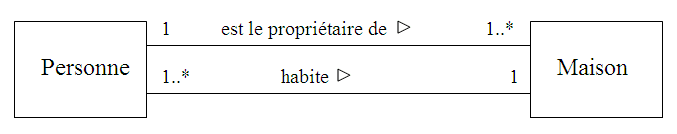 D’une part, une maison a un propriétaire et une personne peut avoir plusieurs maisons ou aucune. D’autre part, dans une maison habite au moins une personne et toute personne n’habite que dans une seule maison.