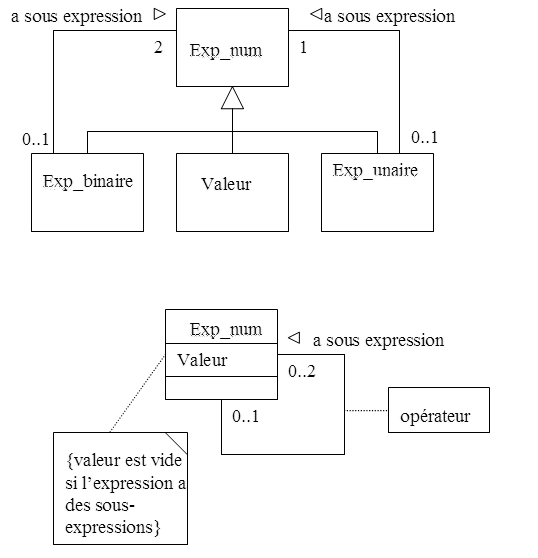 Le premier diagramme permet de mieux exprimer les trois types d’expressions : binaires, unaires et valeur simple. Il permet aussi de contrôler structurellement la consistance de l’expression. Le deuxième diagramme est plus proche de la définition récursive initiale mais demande l’ajout de contraintes pour contrôler la consistance (pour éviter des expressions mal formées, comme avoir une expression avec deux sous-expressions et un opérateur unaire.