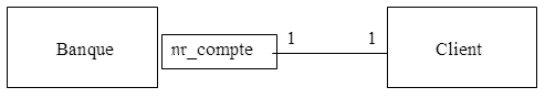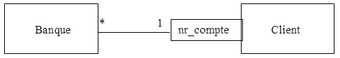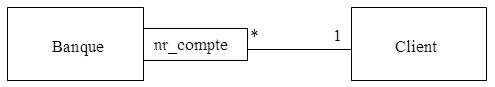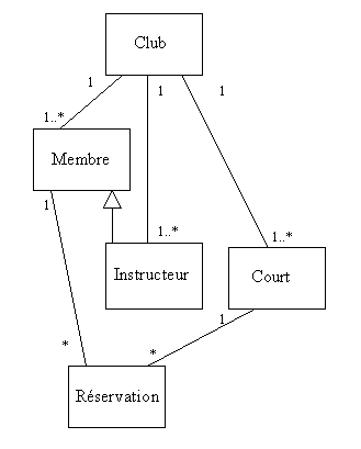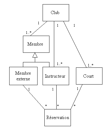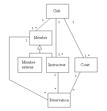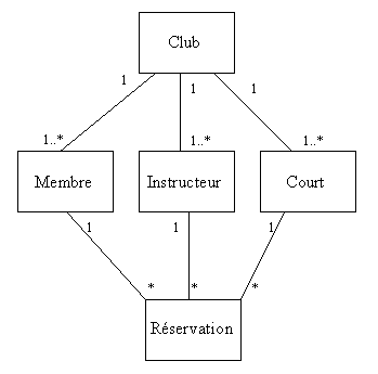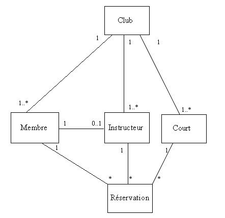 Le club (qui est unique) compte un ou plusieurs membres, un ou plusieurs instructeurs et un ou plusieurs courts de tennis. Lors de la réservation d’une leçon, une association est faite entre un membre, un instructeur et un court. Une réservation met donc en correspondance exactement un membre, un instructeur et un court. Un membre peut faire plusieurs réservations. Un instructeur peut être affecté à plusieurs réservations. Un court peut servir à plusieurs leçons.