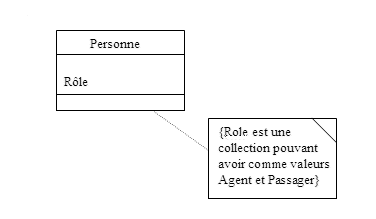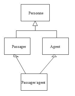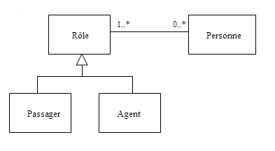 1. Agent et Passager ne sont pas des types particuliers de personnes mais des rôles joués à un moment donné par certaines personnes. 2. De plus, distinguer le rôle de la personne permet facilement de décrire de nouveaux rôles et de séparer des attributs propres à la notion de rôle et ceux propres à l’information d’une personne. 3. La relation entre Agent et Passager, le fait que ces 2 entités soient de la même nature n’est pas évident; il y a plus d’associations à comprendre et gérer. 4. Rôle est un concept ayant probablement des attributs, pas un attribut simple. 5. Outres les problèmes soulevés pour la proposition 1., dans ce modèle, un passager Agent serait en fait modélisé par deux personnes du modèle et une association entre les deux, ce qui ne correspond pas du tout à la réalité.